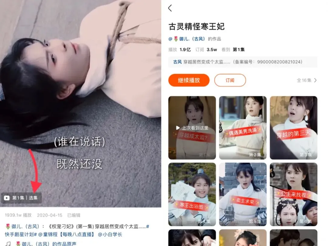 2020 年 4 月,掌握了大量版权的免费小说阅读平台米读与快手合作的第一部竖屏短剧《权宠刁妃》上线,讲述一位“22世纪的国际顶尖女神偷”踩香蕉皮摔倒后穿越回古代嫁给“寒王”的故事。一季 16 集,一集 1 分钟,每 3 天一更,出演女主角的是在快手上拥有 1663 万粉丝的古风人设网红@御儿(古风)。