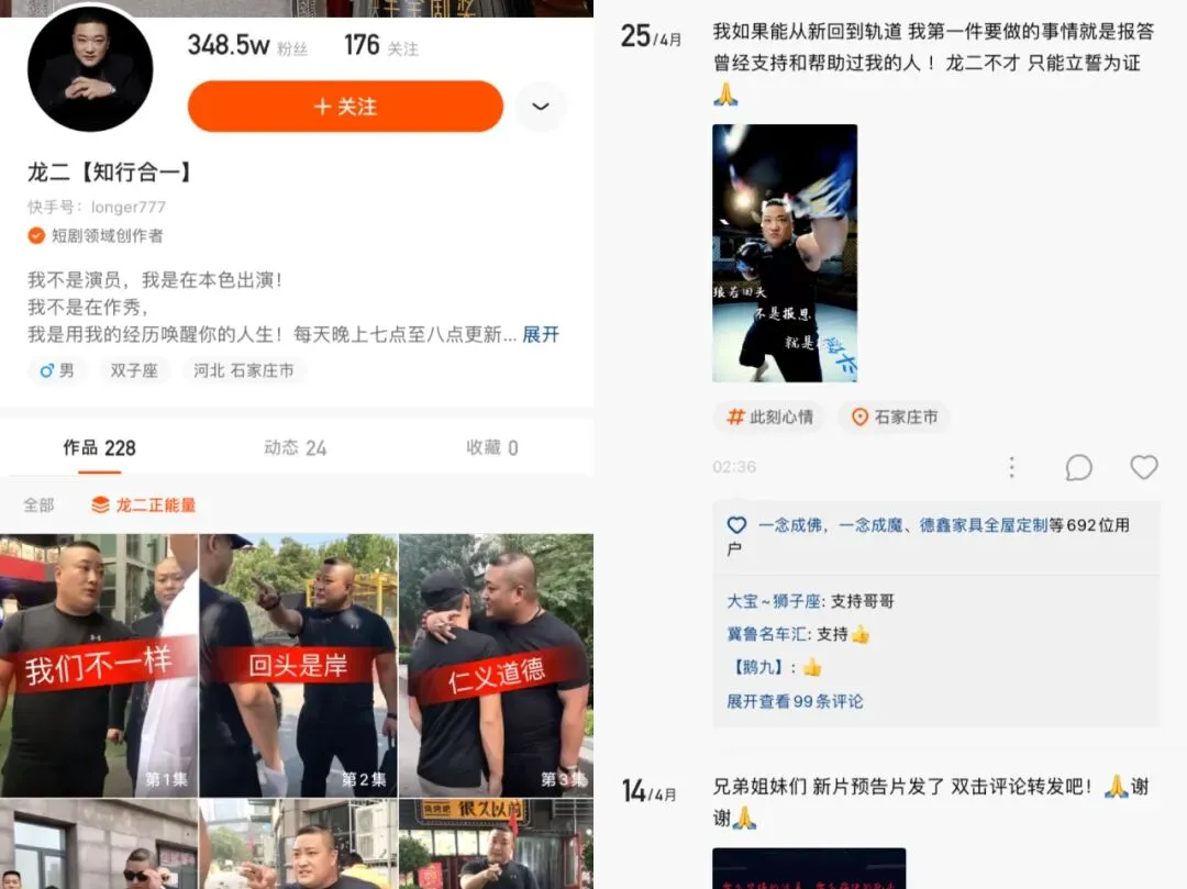 快手上像这样的短剧账号还有很多,但大多是由网红团队打造的人设账号,作品没有连续的剧情,一集一个冲突,且人设通常与角色高度融合。比如有 326 万粉丝的@龙二【知行合一】,其代表作《龙二正能量》现已更新 255 集,一集一个社会大哥重情重义的小故事,与其说是短剧,不如说是段子合集。龙二在剧情中也会使用同一个名字,令观众更觉得角色与网红本人难舍难分。龙二的账号简介是:“我不是演员,我是在本色出演!我不是在作秀,我是用我的经历唤醒你的人生!”