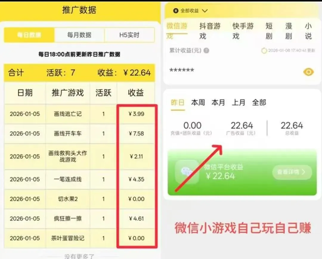 【核心逻辑】广告分成机制:看广告=赚钱微信小游戏依赖广告分成盈利,玩家每看一次广告,游戏商就能获得0.5-1元收益。游戏商将这部分收益分给推广者(就是你!)。你的收益公式:商业广告点击量 × 单价(0.5-1元) × 5个游戏 × 10轮/天 = 日赚30-50元玩家。