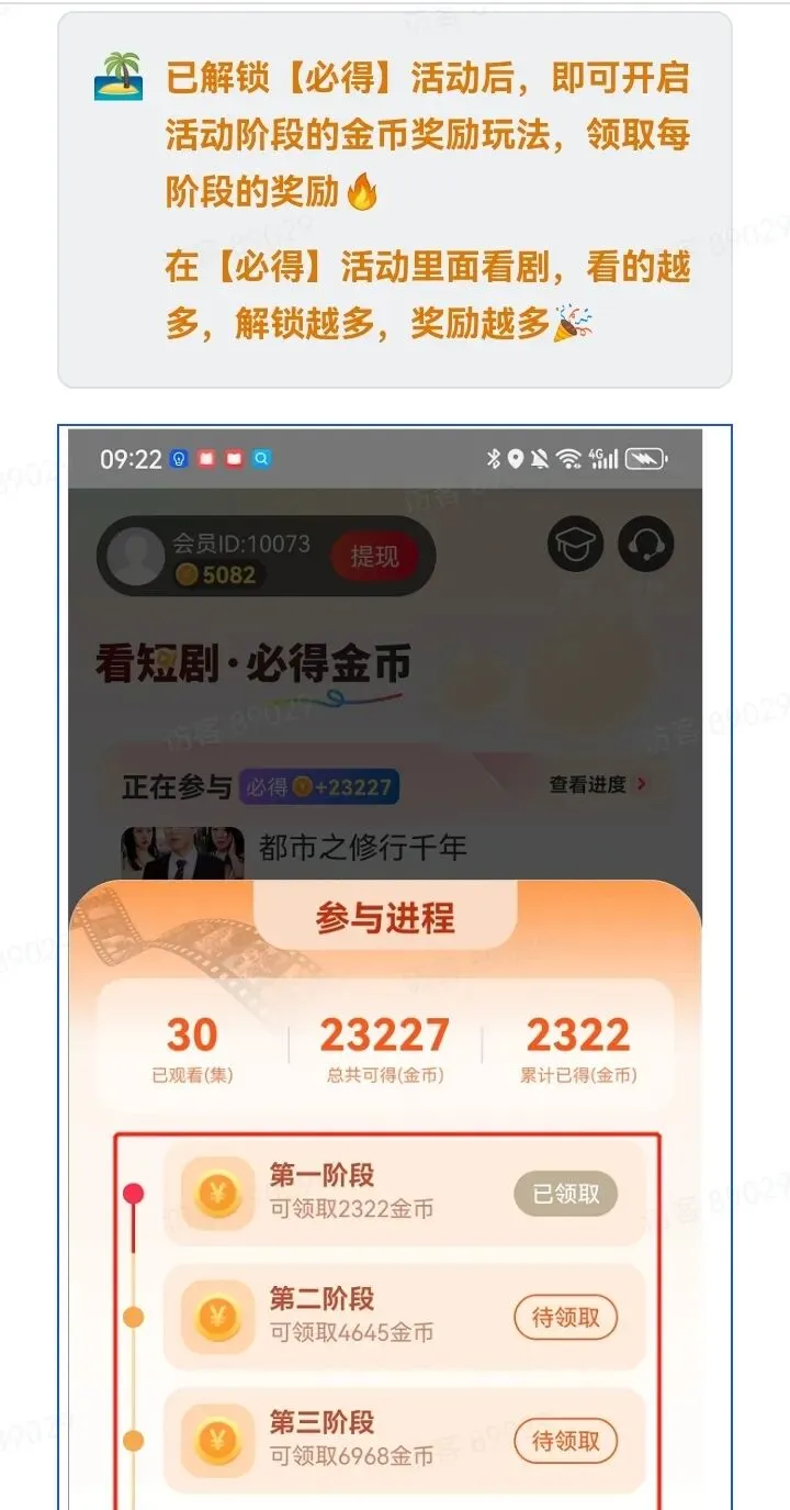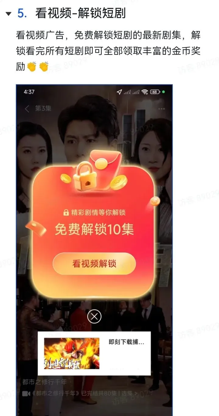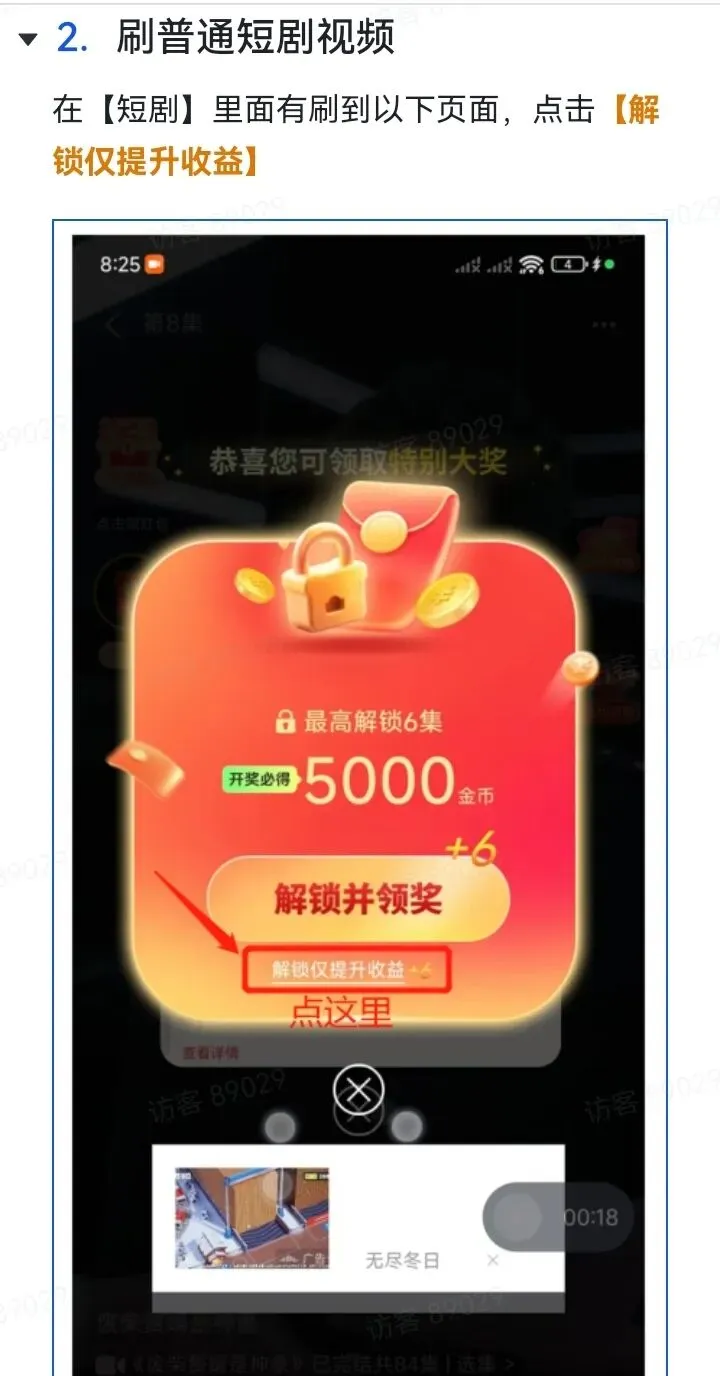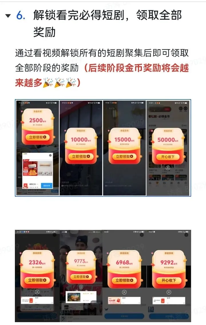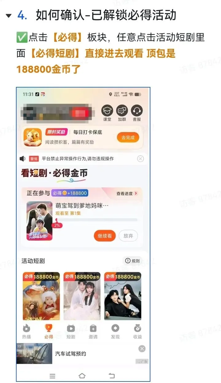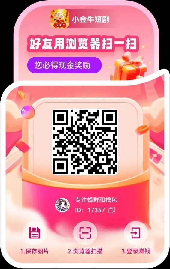 以上功能活动只有膨胀奖励是在收益那界面,其他抽奖,和签到在短剧,必得,收益都能找到他。下面是玩法介绍,顶包是18.8,但是为了去抽奖和膨胀,我们可以去解锁领包5000金币去领取。也可以到必得18.8元去看阶段领取到5万金币今天先结束,明天继续领取。一,浏览器扫码注册下载,仅支持安卓手机。