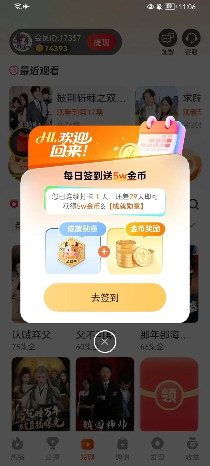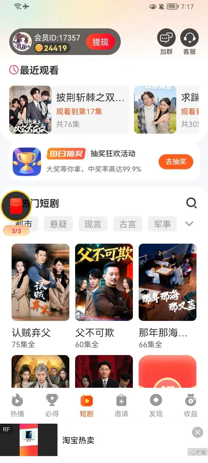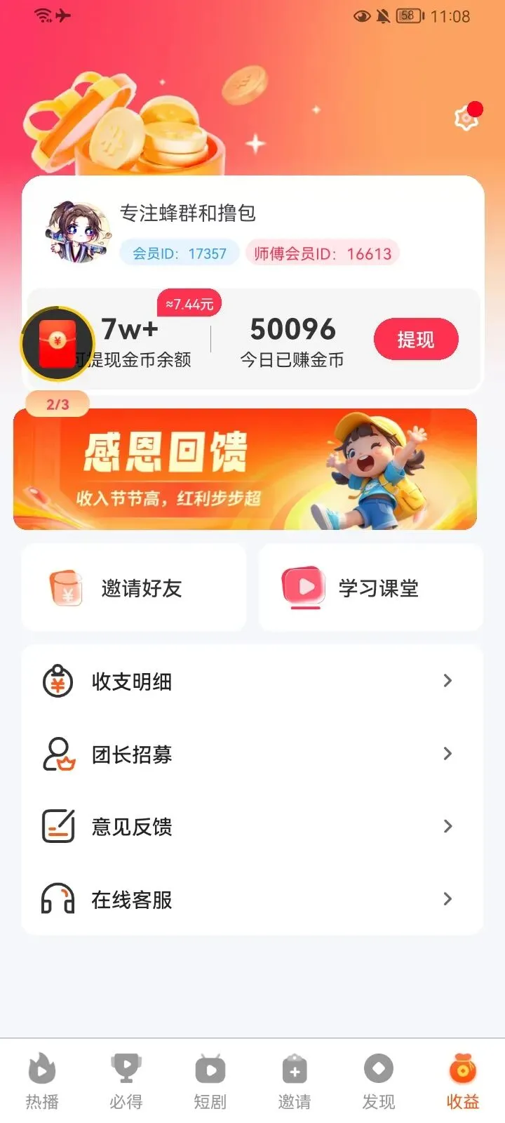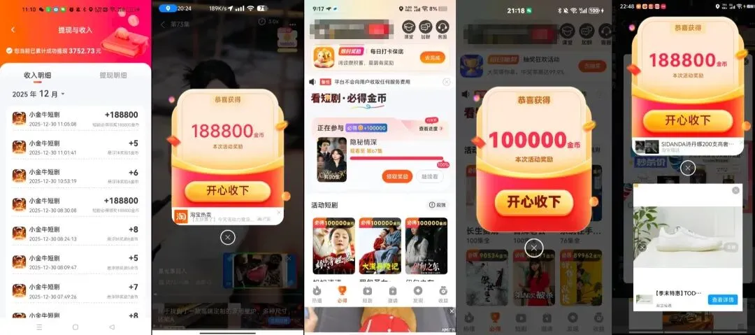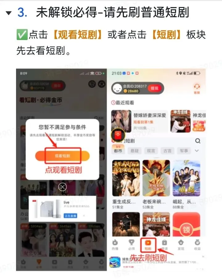 以上功能活动只有膨胀奖励是在收益那界面,其他抽奖,和签到在短剧,必得,收益都能找到他。下面是玩法介绍,顶包是18.8,但是为了去抽奖和膨胀,我们可以去解锁领包5000金币去领取。也可以到必得18.8元去看阶段领取到5万金币今天先结束,明天继续领取。一,浏览器扫码注册下载,仅支持安卓手机。