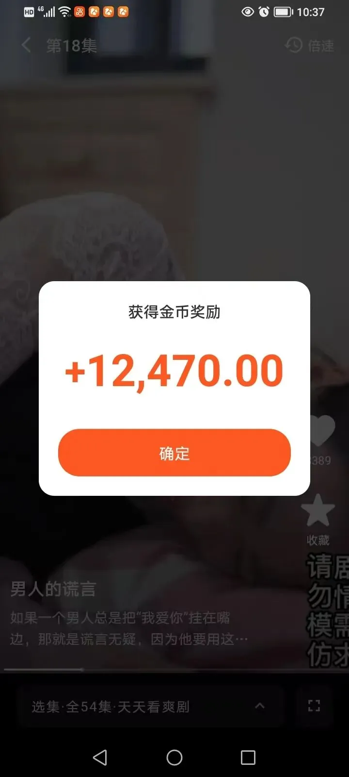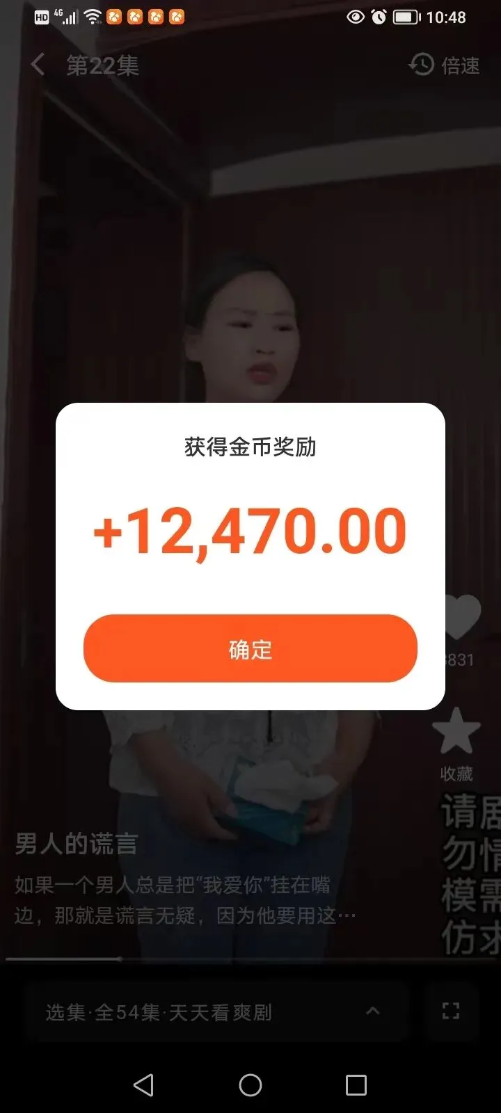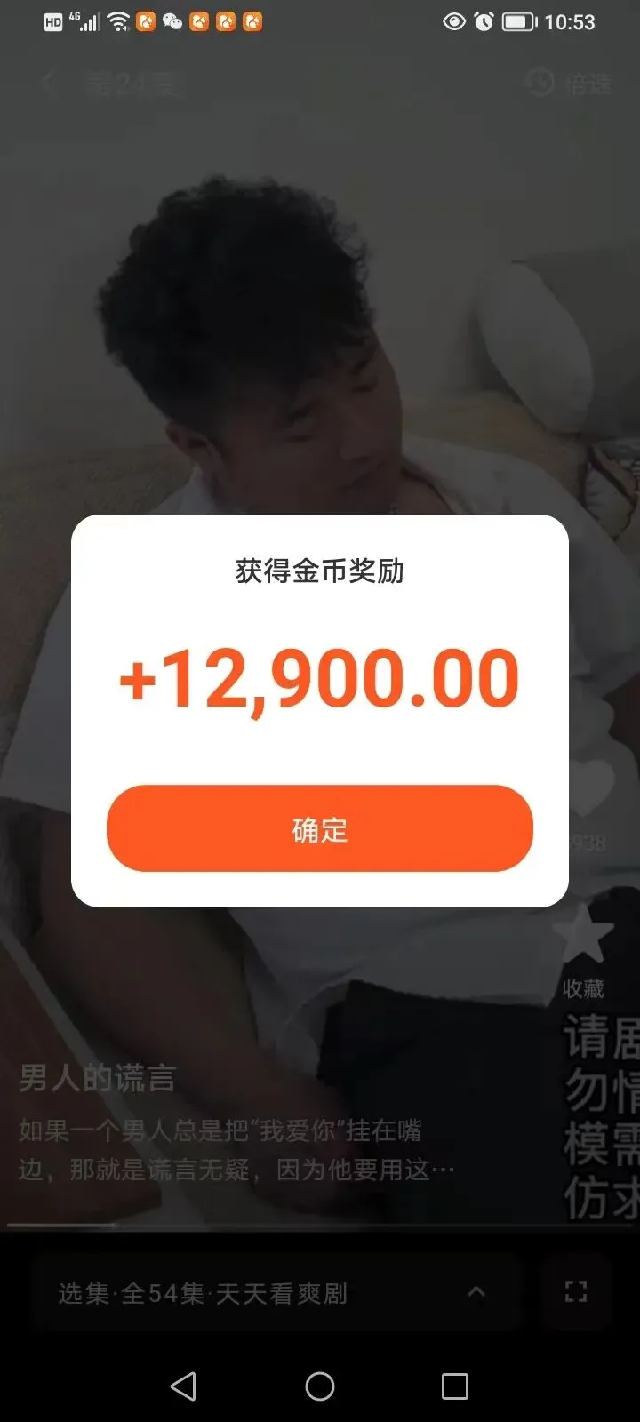 第三,跟着热门短剧走准没错! 平台肯定是给热门剧集更高的金币权重啊!像《男人的谎言》这种54集的长爽剧,每集奖励都很可观,而且剧情连贯,刷起来不费劲,不知不觉就能攒一堆金币,简直是躺赚!