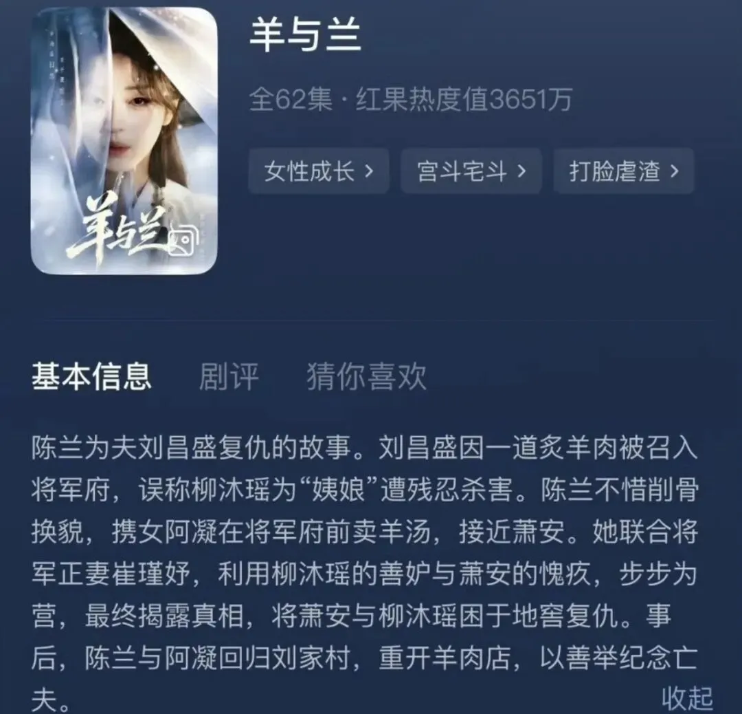 这个名字就取的很特别啊。Girls help girls的复仇爽剧,结局无谅解。剧情:陈兰的夫君因为烤羊肉很有名,被召去将军府,却因称恶毒女配为姨娘后惨遭杀害。陈兰带着女儿复仇,削皮换骨后在将军府门前卖羊汤,后入将军府为妾,最终大仇得报。
