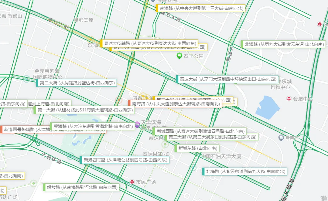 工作日早高峰7-9时,晚高峰17-19时,红色区域为车多缓行区域,黄色区域为流量增加区域: