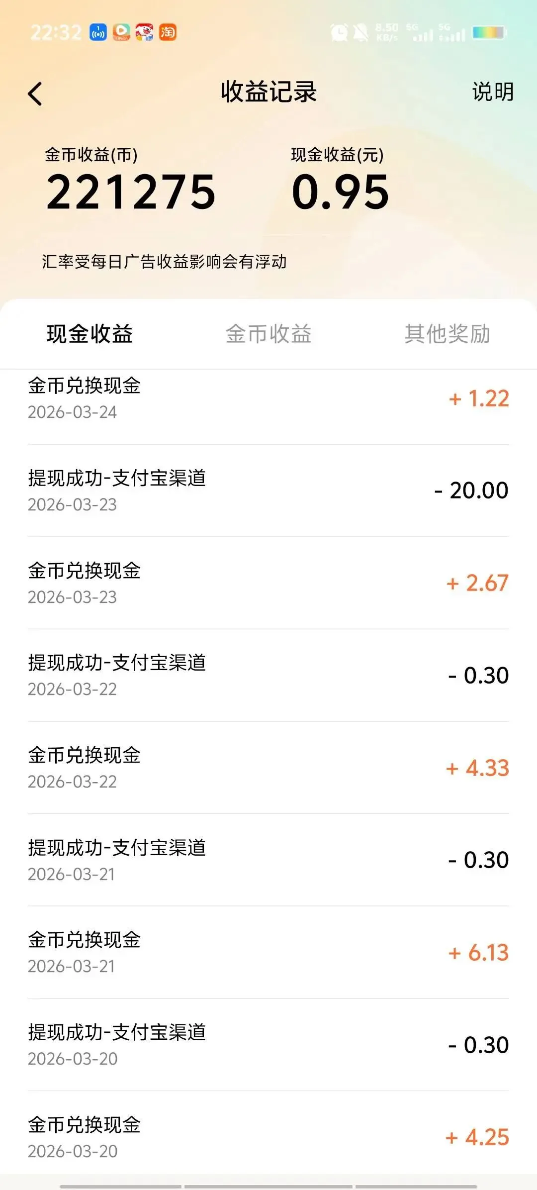 收益真实,可提现:实测金币兑换比例稳定,虽然单条广告赚的不多(1000多金币大概能兑换0.03元左右),但积少成多,每天半小时小时,一个月下来能赚几十上百块,提现到不常用的账户里,积少成多,也是一笔小惊喜。