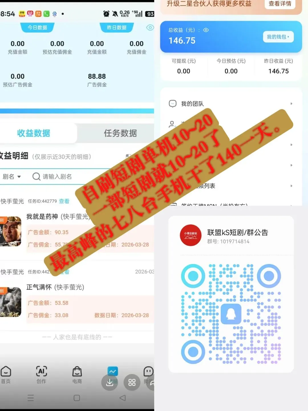 △一部手机就可以了!自己发自己刷一个手机刷一部短剧,有10~20块了!听安排听指挥的基本上每天能稳定,而且还全程免费带免费培训!一天就直接零拍上手!第3天直接显示收益!