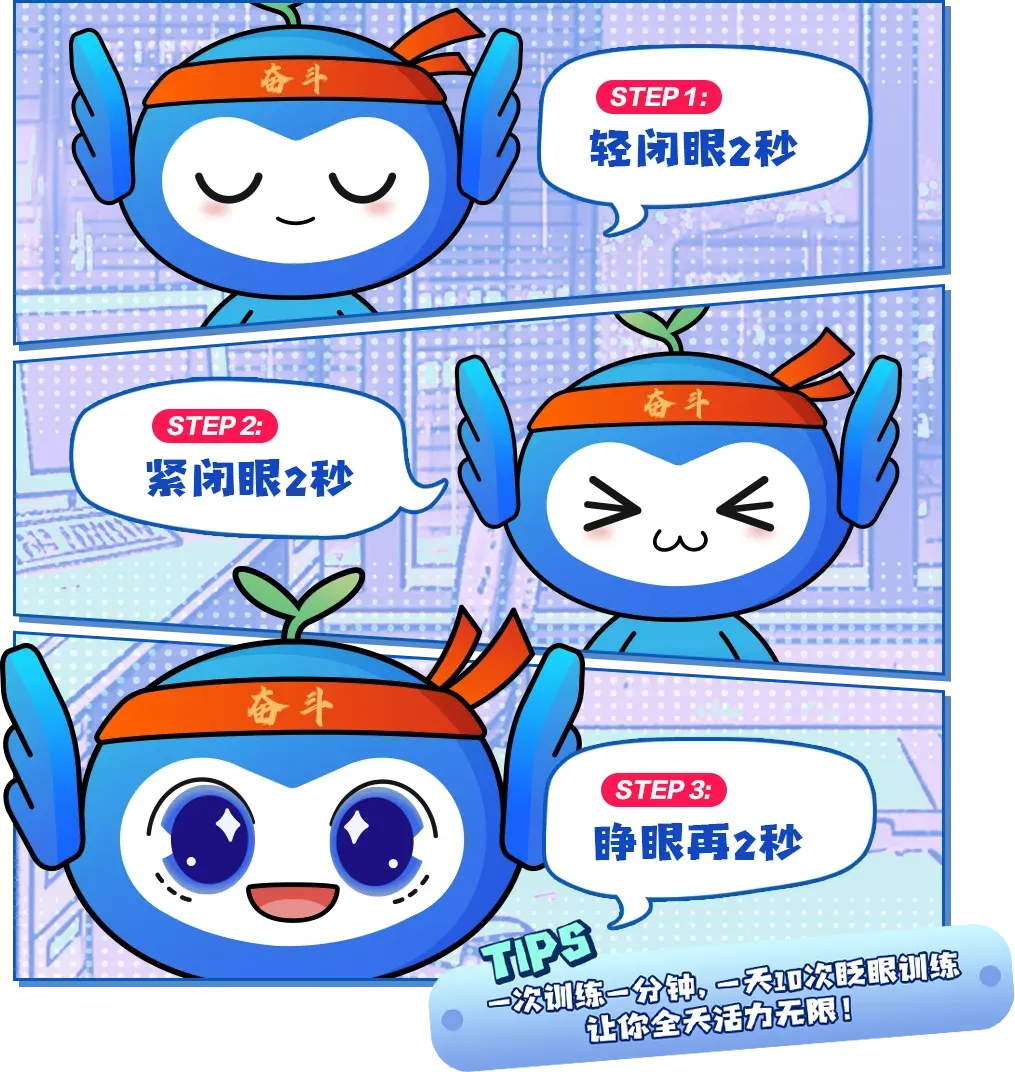 建议多做眨眼操:轻闭眼2秒→紧闭眼2秒→睁眼再2秒。每次训练1分钟,每天至少做10组眨眼训练!
